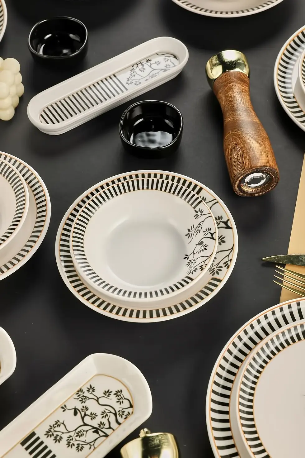 MODALİVİNG Aura Bahçe Lüx Seramik Siyah Beyaz 24 Parça 6 Kişilik Yemek Takımı